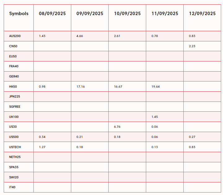 Ten harmonogram zawiera informacje o dywidendach – w tym symbol, datę i kwotę dywidendy – zarówno dla CFD na indeksy, jak i CFD na akcje. Możesz wyszukiwać konkretne dywidendy według daty lub symbolu, korzystając z funkcji wyszukiwania na stronie.